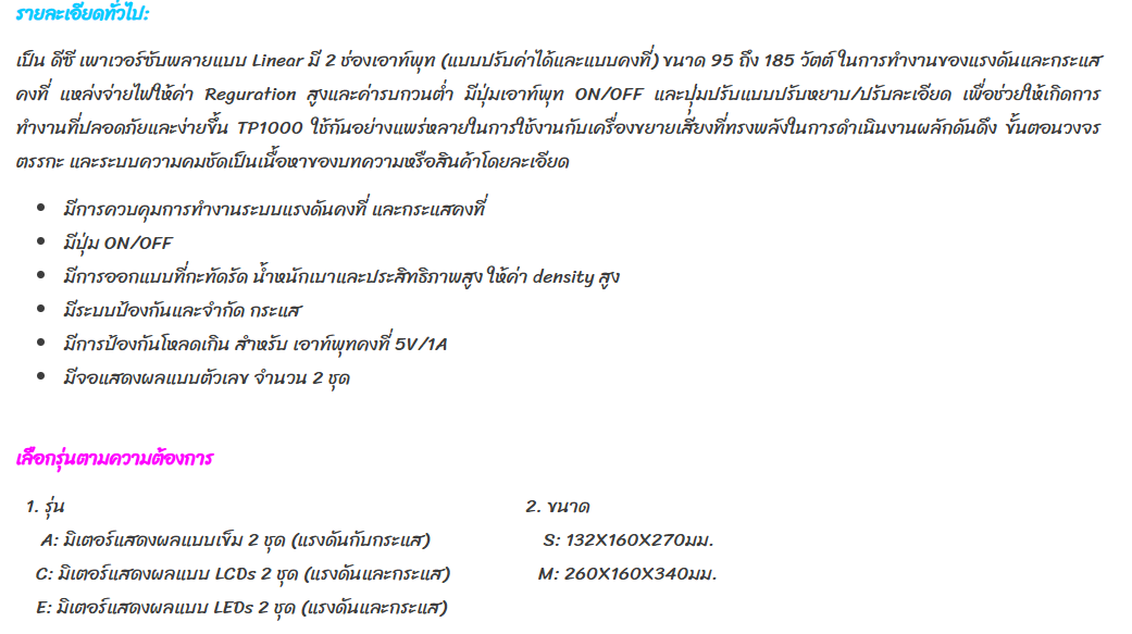- ค่าเอาท์พุทแรงดันไฟฟ้าและกระแสไฟสูงสุด 70V และ 20A