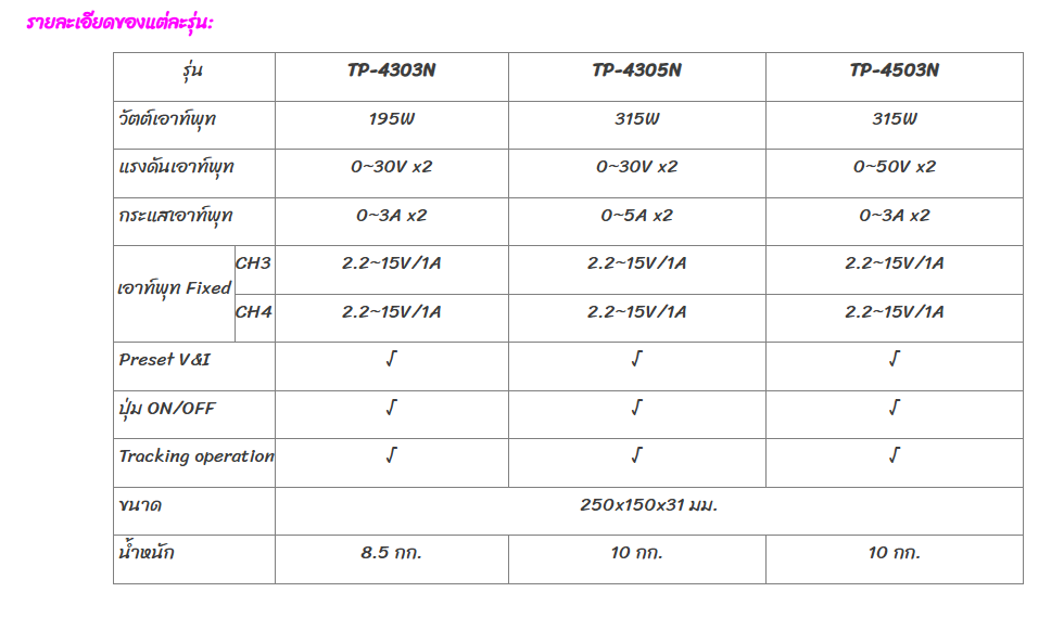 - มีลักษณะการจ่ายไฟแบบ 2 เอาท์พุทหลัก จ่ายแรงดัน 0–30V และอีก 2 ช่องเอาท์พุทรอง